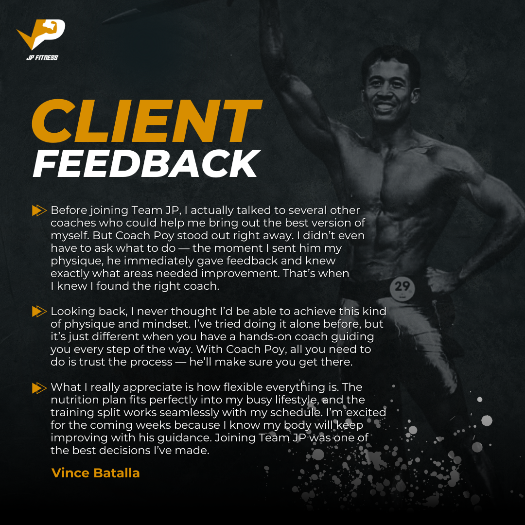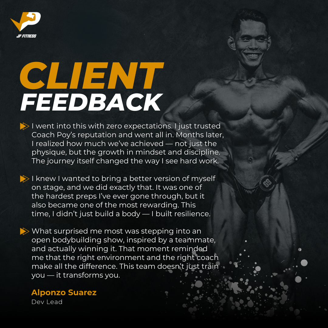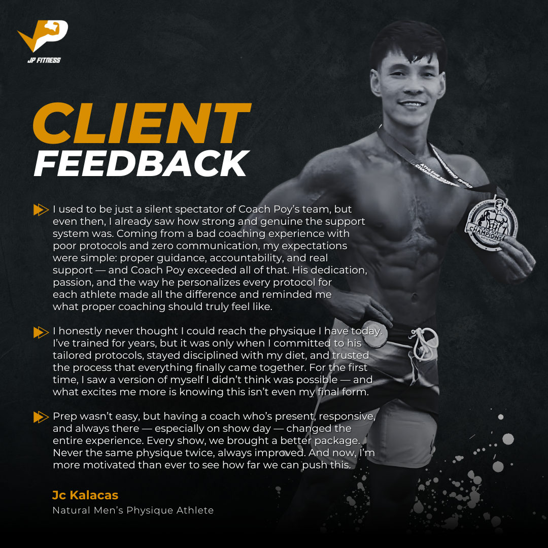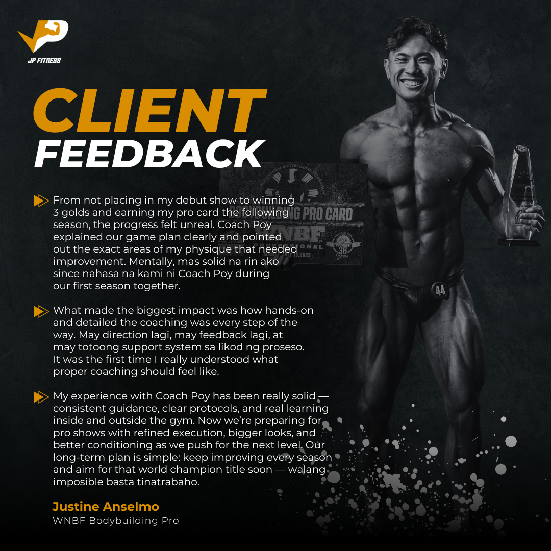 At JP Fitness, we focus on coaching and supporting athletes in natural bodybuilding. Whether you're a first-time competitor or experienced athlete, we help you reach your full potential with personalized, proven methods. We build champions and celebrate the art of natural bodybuilding.